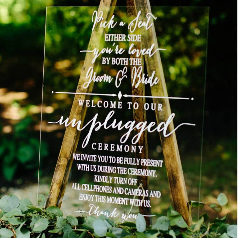 Acrylic wedding signs unplugged wedding sign acrylic unplugged sign unplugged ceremony sign acrylic signs signs for wedding clear wedding signs modern wedding decor wedding. Acrylic wedding sign clear wedding sign plexiglass sign. 5 out of 5 stars.